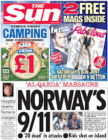 The first approach is simply the set response to Islamist terrorism, especially since the events of 9/11, almost exactly 10 years ago now. And it was on display in the hours after the atrocities in Oslo and the island of Utoya. Rupert Murdoch’s The Sun, as if his editor didn’t realise how much trouble he was having currently, immediately seized on the attacks as a Jihadist plot with this front page:
